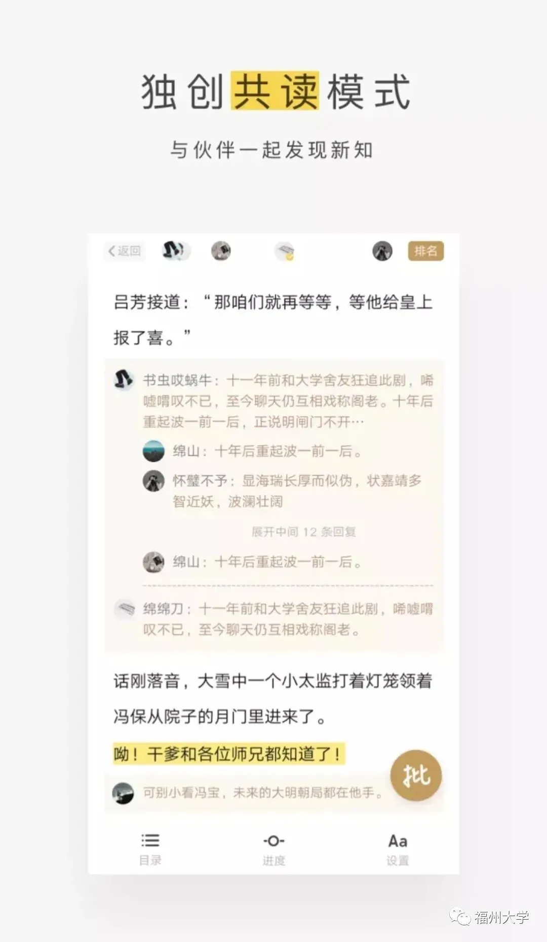“可以和好朋友一起读书”,微信读书有它特有的社交属性,可以看见好友的阅读书目,提供了一种交流的可能性,大方简约的阅读界面也为它添加了不少闪光点,特有的“好友帮点”获取图书机制也带动了不少小伙伴读书的热情。