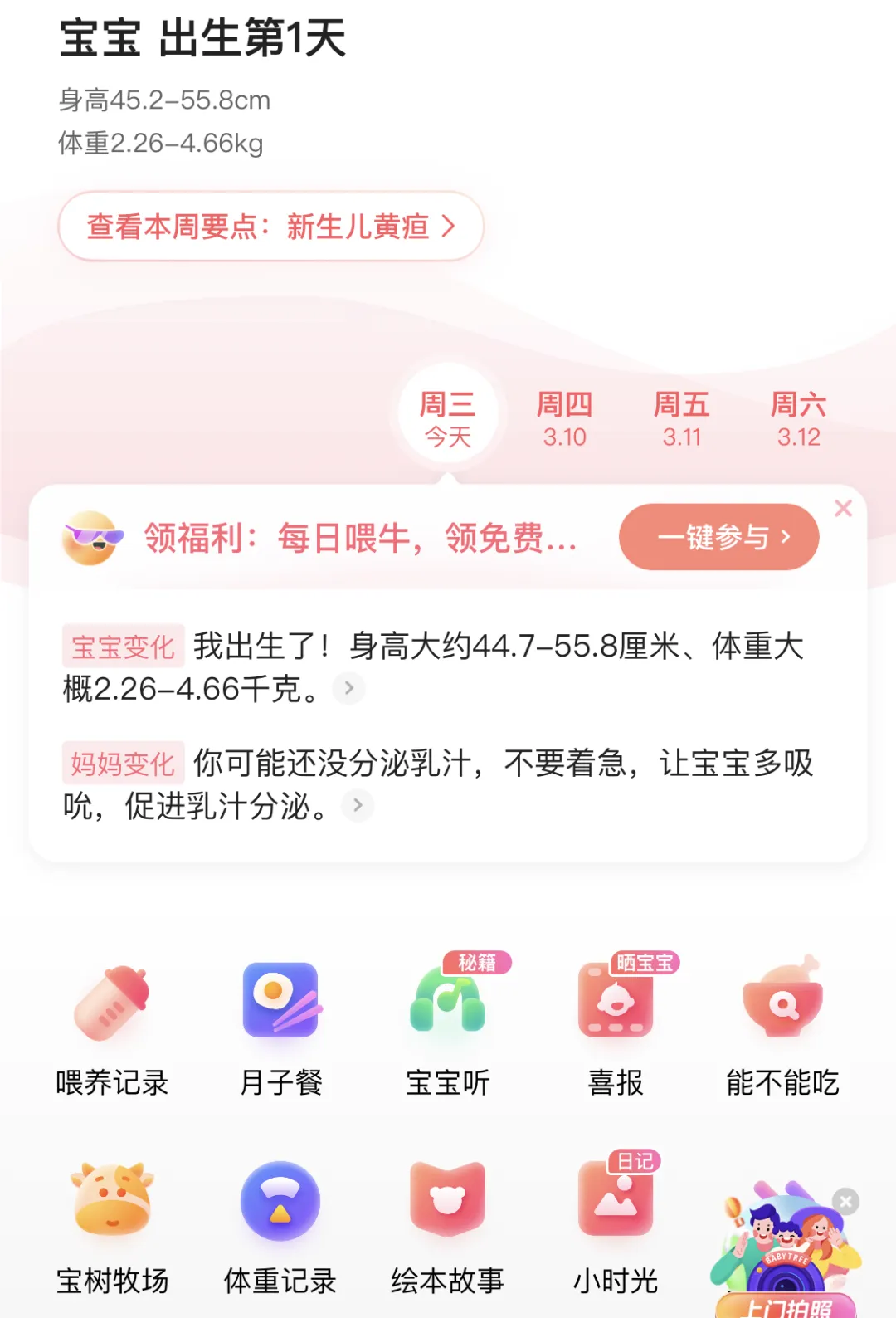 如果宝宝已经出生了,我们可以用它来记录宝宝的成长过程,每周还会收到不一样的注意事项提醒,比如刚出生的宝宝就要注意新生儿黄疸的情况。