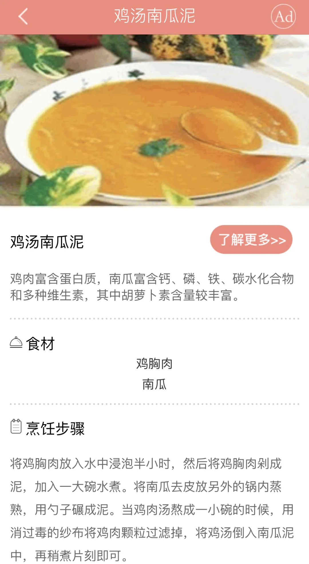 比如这道适合6个月以上宝宝的鸡汤南瓜泥,点开后,我们可以看到需要准备的食材有鸡胸肉和南瓜,还能简单了解这道辅食含有的营养物质有哪些。烹饪步骤介绍得简单明了,基本上一看就会,手残党麻麻也不用担心。