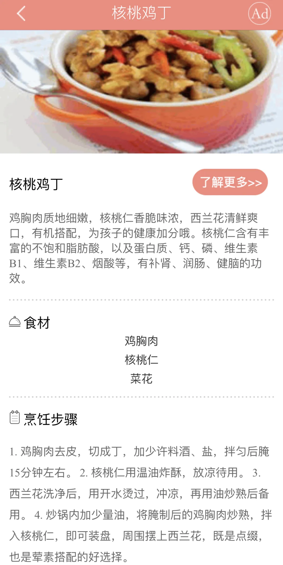 再比如这道适合3岁以上宝宝的核桃鸡丁,我们可以明显感受到,食谱中对于食材的处理及烹饪方法与小月龄的宝宝有了挺大的区别。其实对于精通厨艺的麻麻来说,也可以参考这个软件中的食材搭配,获取一些灵感,让宝宝吃得更丰富。