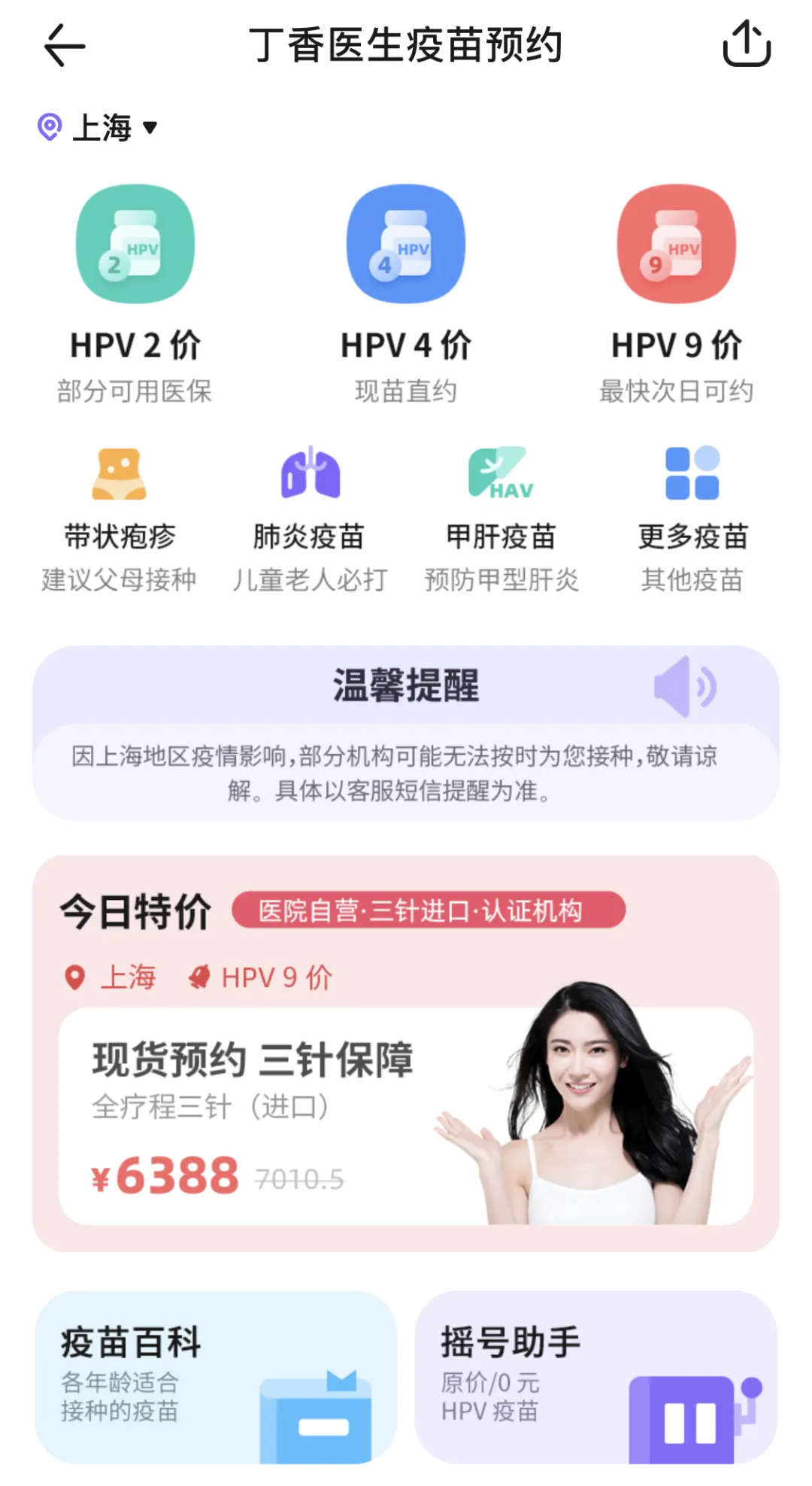 另外,在这个软件上,我们也可以直接预约疫苗,从宝宝到成人的都有,包括现在很热门的HPV疫苗,Jojo妈大概看了下,有些私立医院还是有货的,有需要的姐妹们可以自己预约哈。