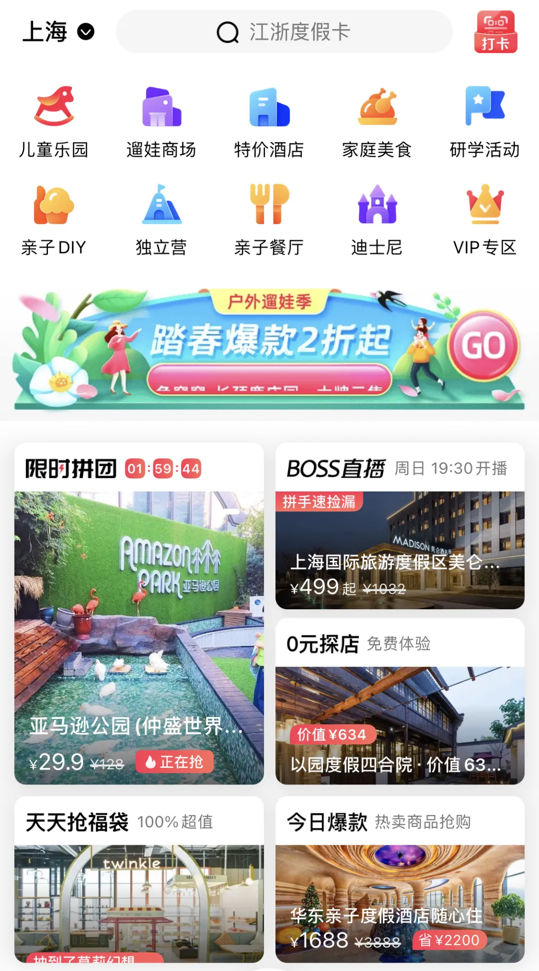 它里面集中了你所在地区的所有亲子玩乐项目,包括儿童乐园、溜娃商场、特价酒店、亲子DIY(自制)等等,点开每个板块,都会有一些优惠于市场价的团购活动,会比直接去现场买票划算很多。