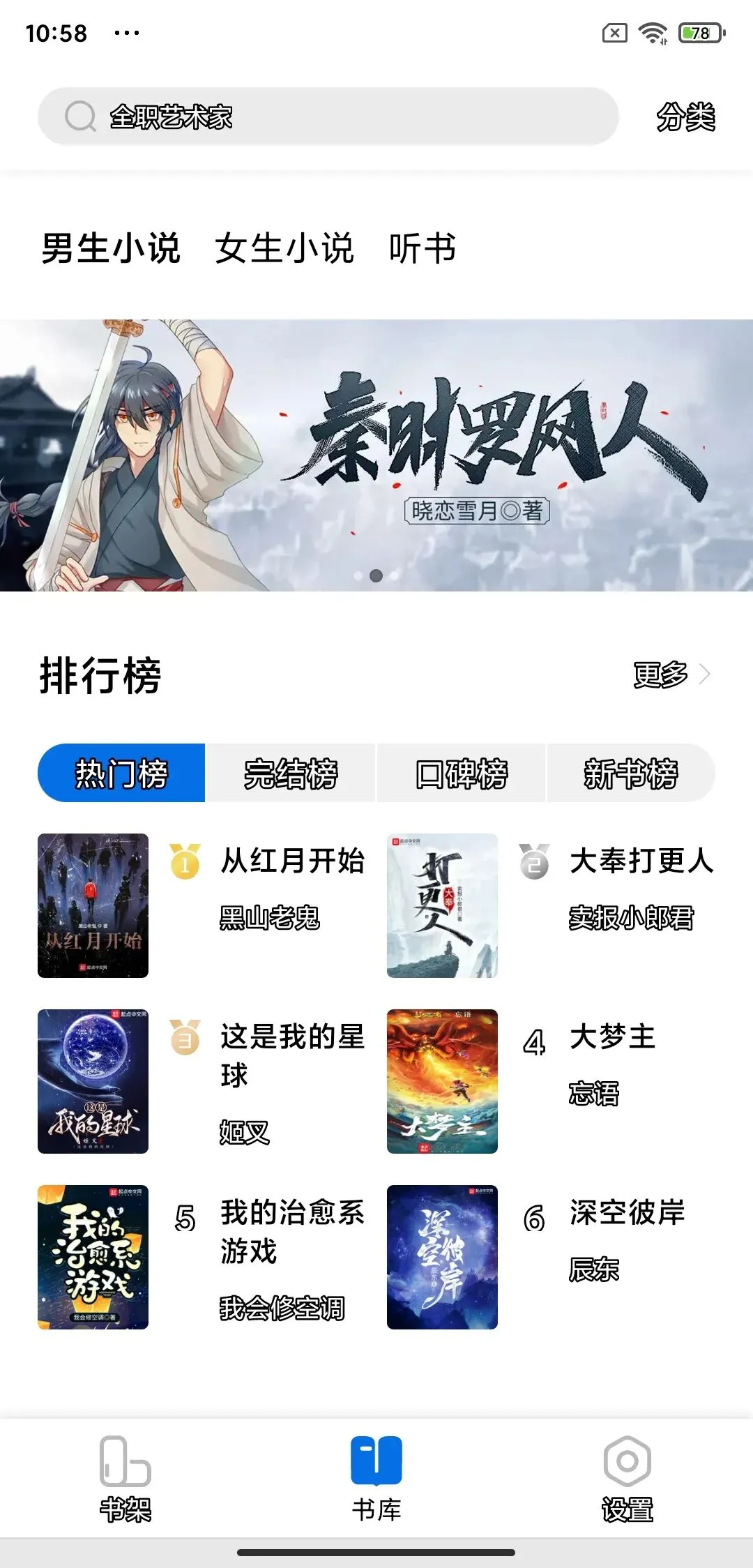 进入界面之后,会直接打开「书库」。里面依旧可以选择男生小说、女生小说和听书3个类型,界面非常清爽,不需要注册和开通任何会员。