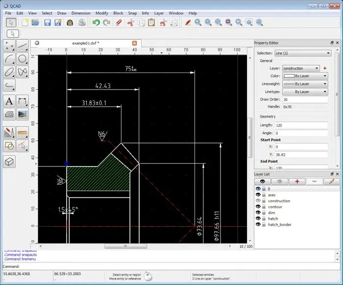 该程序的功能列举如下:图层、块(分组)、35种CAD字体、40多种施工工具、20多种修改工具等等。许多用户都非常喜欢QCAD易于使用的界面和多功能性,给出了很高的评价。