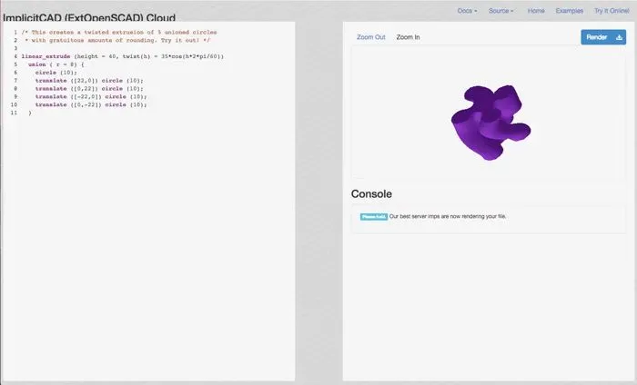 ImplicitCAD网站表示:“ImplicitCAD项目致力于利用数学和计算机科学的力量来解决3D打印革命中的愚蠢设计问题”。ImplicitCAD是一款开源程序化CAD工具。这意味着ImplicitCAD使用了一种可以编译成3D对象的编程语言。