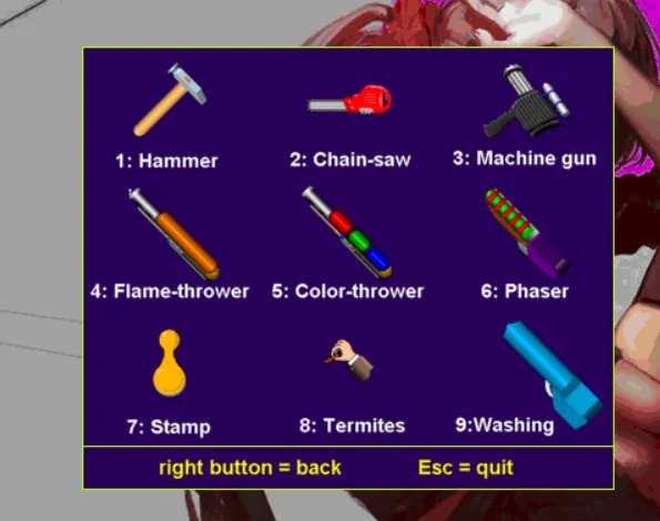 如果还是不好玩,还可以继续换武器。里面有8个武器和一只蚂蚁,有机关枪、火枪、水枪、印章、激光、涂料等等。