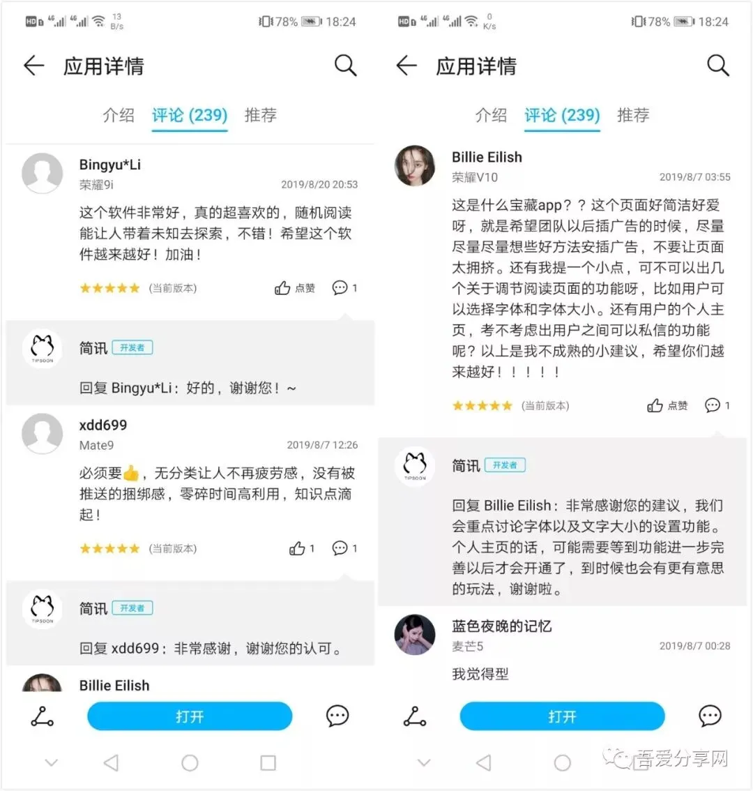 随手截一下华为应用商城该软件的介绍,从开发者认真回复网友点评的态度就可以看出该软件的良心了。