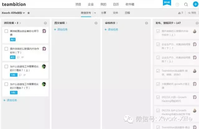 Teambition是一款适合于团队使用的在线项目协作工具,相比同类软件,它的强大之处在于极简的页面。你可以自定义项目的board,可以按照时间的顺序划分,也可以按照项目的不同功能划分。board是一个项目的大框架,需要的就是直接表现形式,整个项目处于到什么样的阶段,已经完成了哪些任务,一目了然。除了任务之外,还有分享、文件和日程等板块。