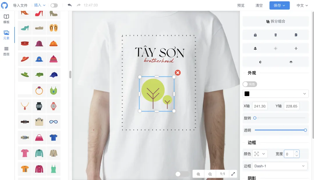 支持形状素材、线条绘制,渐变、边框、透明度、阴影设置。
