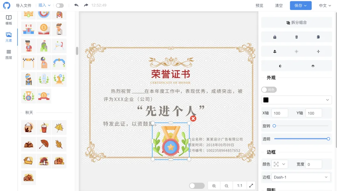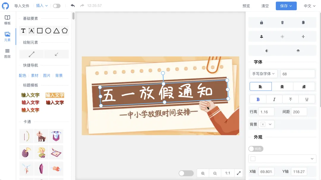 元素支持拖拽、组合、层级管理、多种对齐操作。