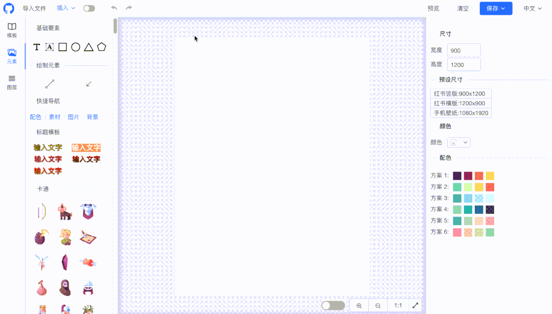 画布可自定义尺寸、放大缩小、辅助线、标尺功能。