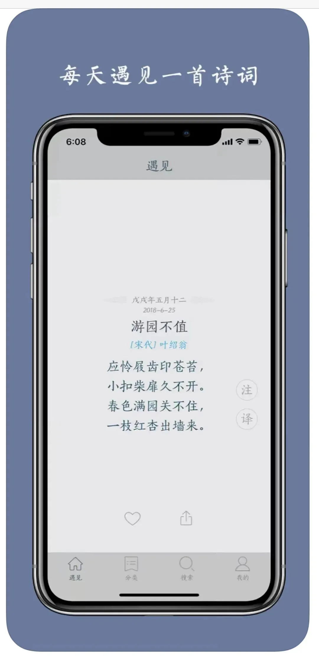 介绍:一款获得苹果 App Store 首页推荐的优美诗词应用,每天自动推荐一首诗或词,安静地读一下,为繁杂的生活增添一丝宁静,希望那一份绵长词韵能触摸你我的心灵, 让忙碌的生活里充满美好的诗意与诗情。