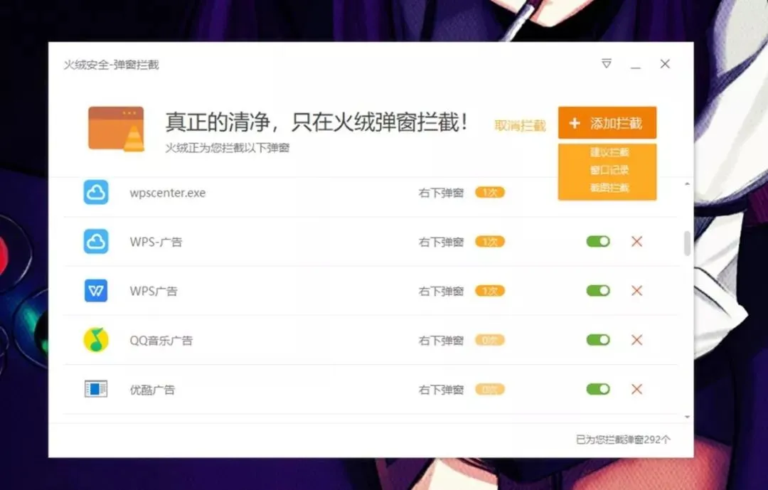 它自带的弹窗拦截功能非常好用,这也是我装它的原因,能自动分析并一键拦截广告,还能实时记录窗口,手动拦截各种很难检测到的广告窗口。