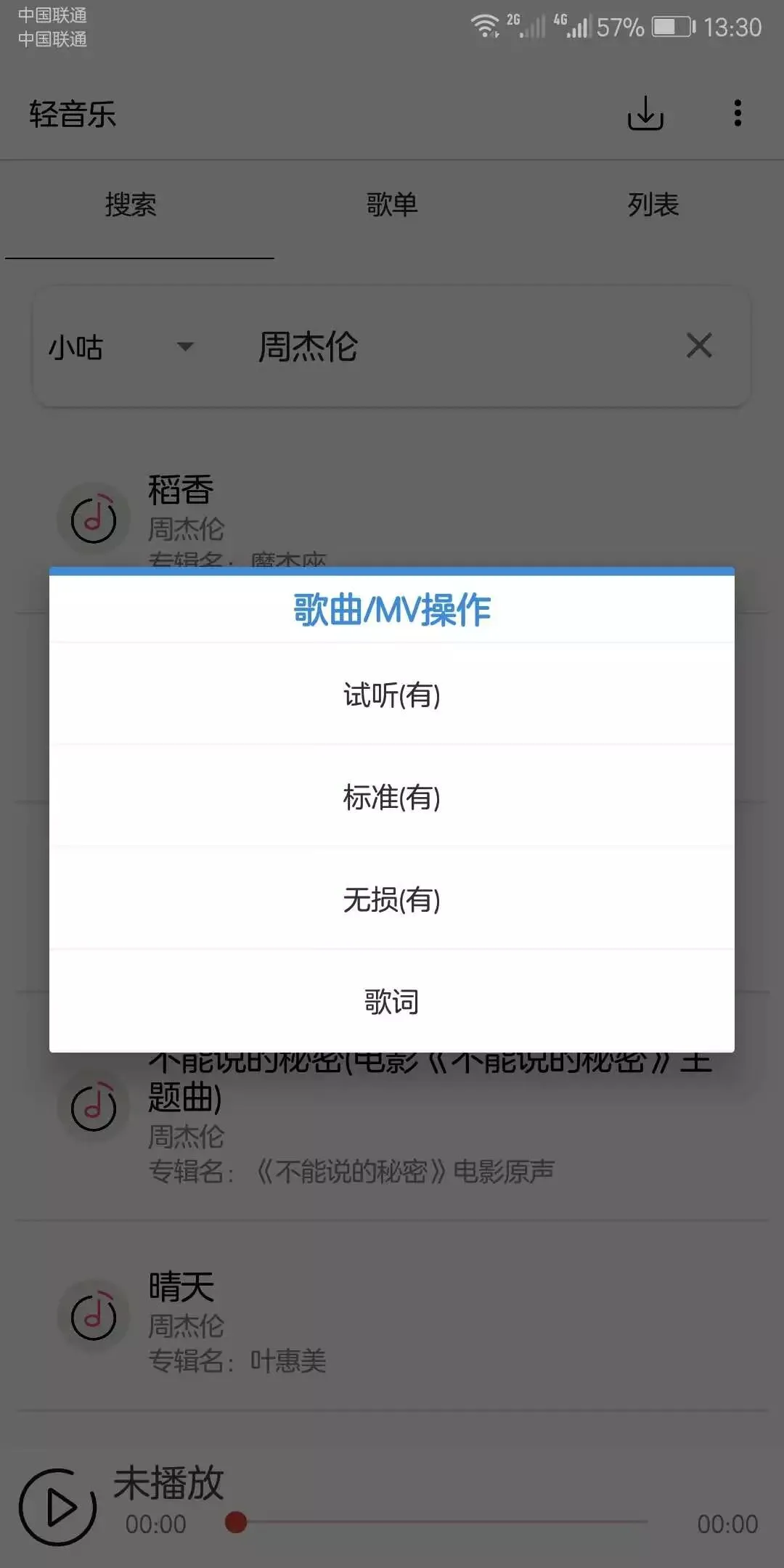 我们这里选择一首歌曲,点击下载!这里大家可以看到有三种品质供大家来选择。试听、标准、以及无损品质。大家可以根据自己的喜欢选择下载!