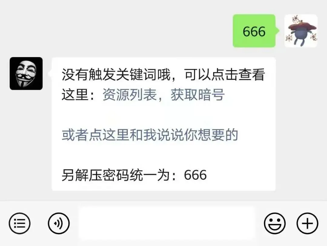 部分同学应该知道,小资的公众号里面有个资源收集营,输入的关键词不匹配之后呢,会自动弹出超链接: