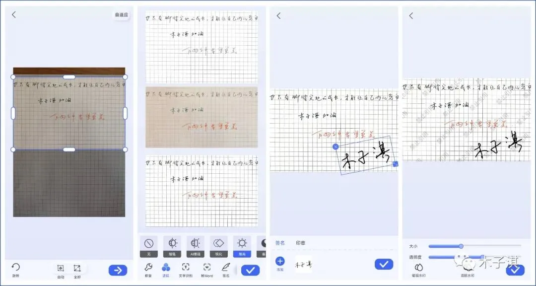 它支持文档扫描功能,支持自动矫正文档,支持多种修复效果,包括:去阴影、去水印、去手写、去屏纹,支持多种滤镜效果,包括:增强、AI 增强、锐化、增亮、省墨,支持添加手写签名,支持添加水印,支持多种格式导出,包括:PDF 、图片、长图。