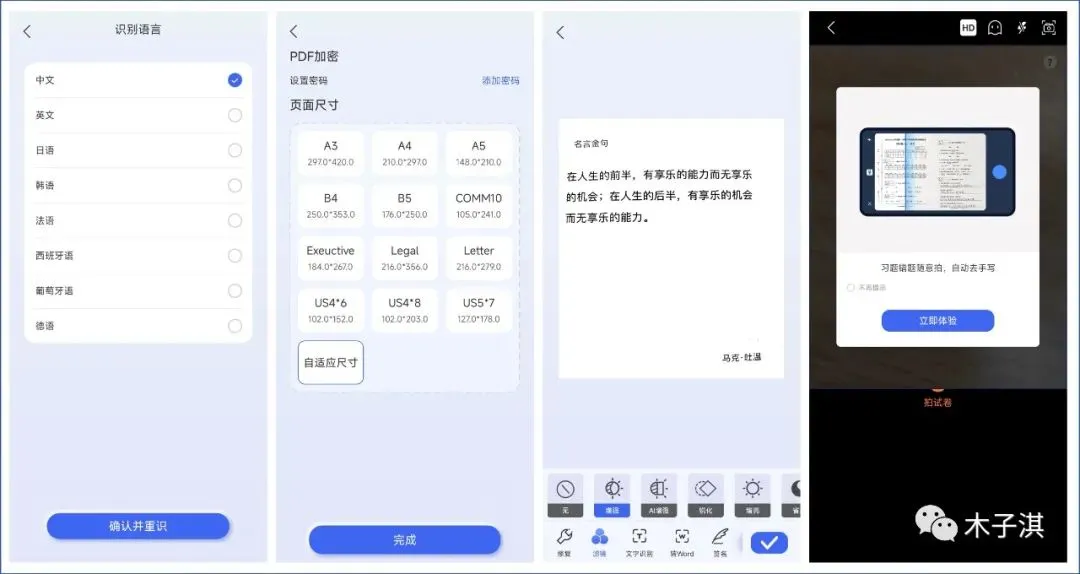 它目前完全免费,简洁干净,画风唯美,功能强大,使用场景非常丰富,支持的功能包括:文档扫描、证件扫描、拍屏幕、拍图转 Word 、拍图转 Excel 、拍图识字、拍试卷、手写识别、PDF 转 Word 、PDF 转 Excel 、PDF 转图片、PDF 转长图、PDF 合并。