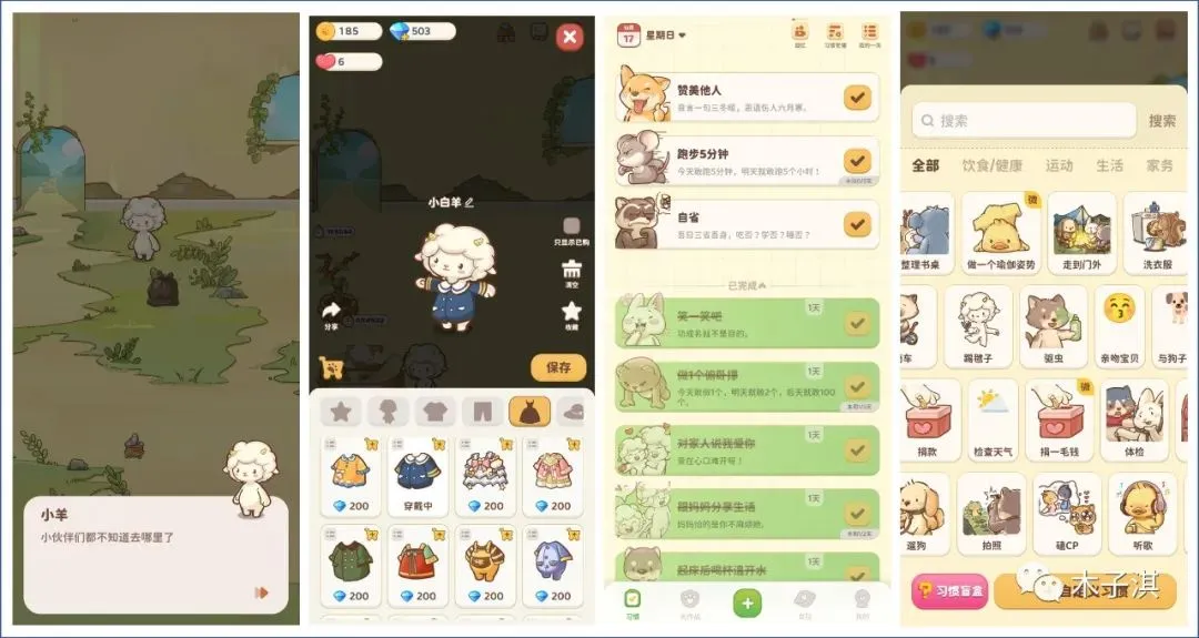 它支持个性化装扮功能,包括:多个可爱的动物形象、衣服、裤子、帽子、眼镜等。
