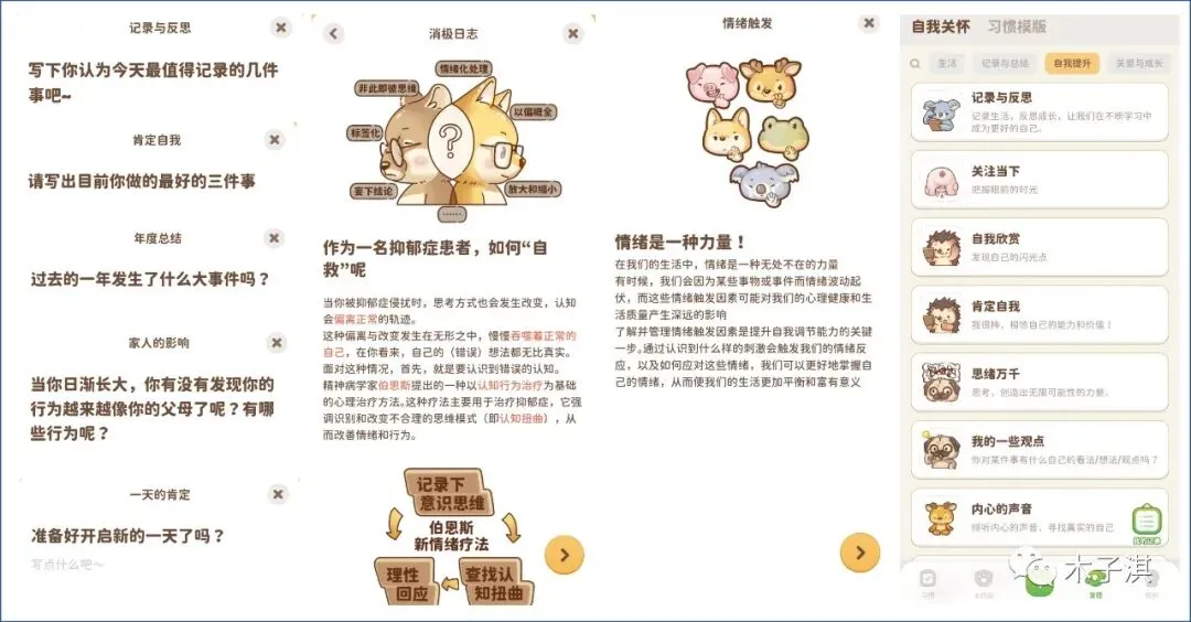 这个板块可以帮助你一步一步记录、倾诉情绪、释放压力;例如积极日志包括:今天有什么让你感到开心或者满足的事情、详细描述下那个时刻、在这件事中是否发现了自己的优点或成长、根据这次经历觉得哪些事情你可以期待。