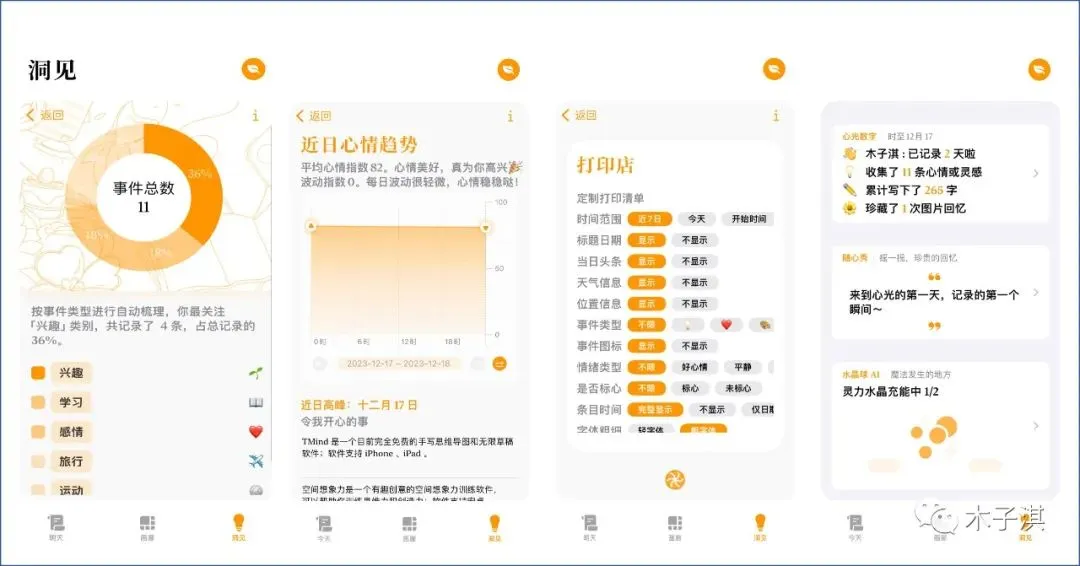 它支持 AI 反馈与分析功能,支持自动分类标签、智能事件分类、自动绘制心情趋势和图表、自动月度个性化杂志、自动梳理条目、自动提炼每日重点方便回顾。