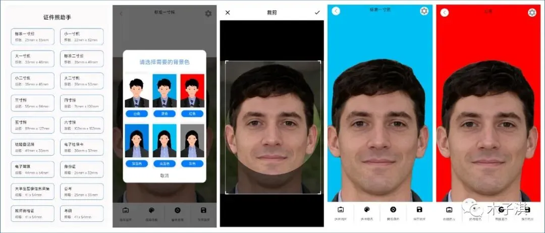 选择一个证件照尺寸,然后可以选择图片、选择底色,软件提供了白色、蓝色、红色、深蓝色、亮蓝色、灰色 5 种背景色。