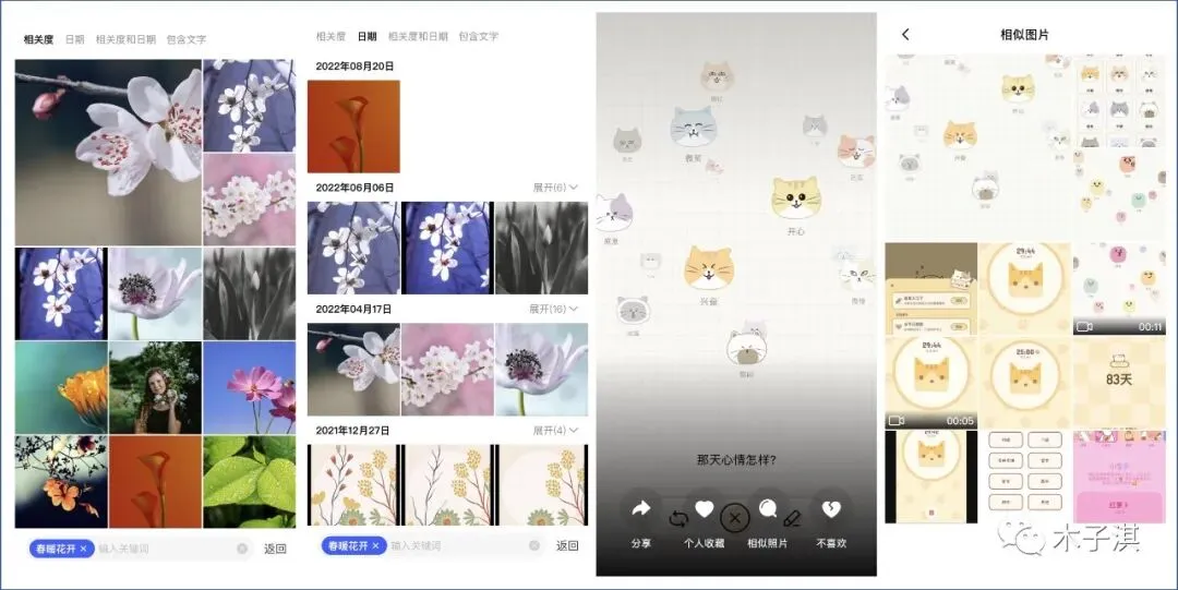 它支持多种照片搜索结果,包括:相关度、日期、相关度和日期、包含文字,支持照片智能分类。