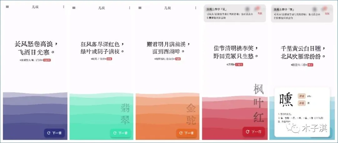 它非常具有特色,每句诗词都会被染上独特的中国色彩,每个界面都有不同色彩的动态波浪,配合唯美古诗词,让人惊艳;并且当夜幕降临,界面还会有动态的荧光点缀,就像夜空中闪烁的星辰。