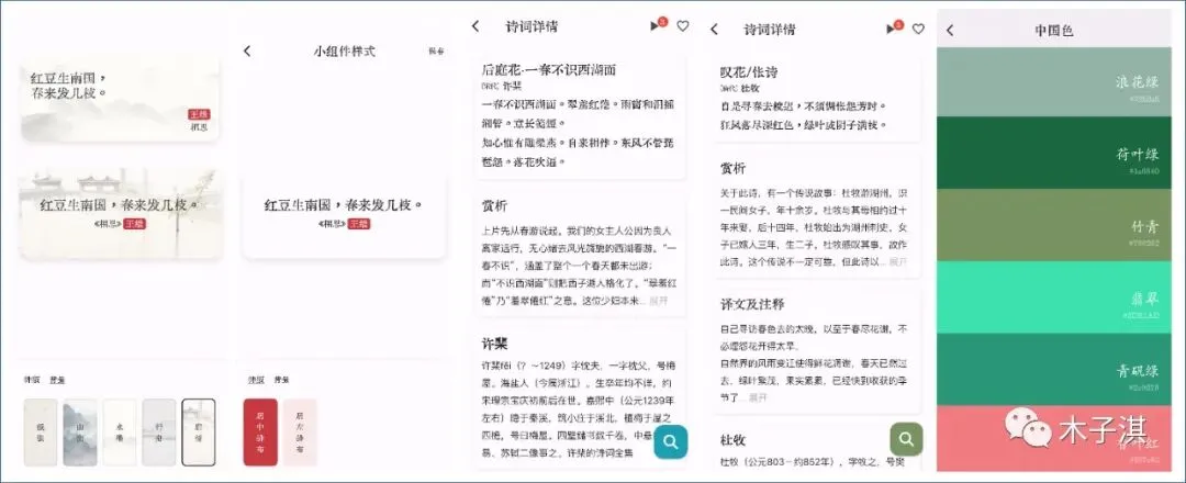 它还支持唯美的桌面小组件,提供了 2 种排版和 5 种古风背景,可以将古诗词放在手机桌面。
