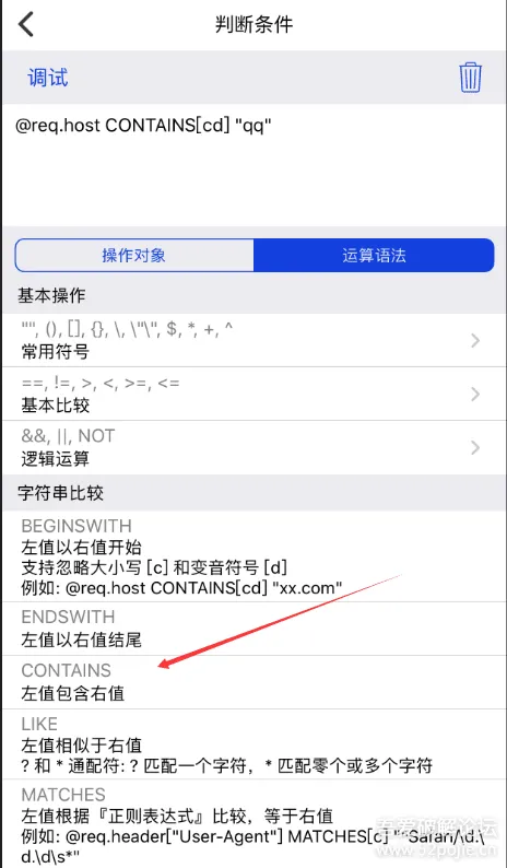 点击运算语法 选择CONTAINS加一个大括号[cd]里面填CD的意思是忽略大小写和一些符号 只要匹配到这个请求链接里面有baidu字串符的都屏蔽掉 不管它是www.a.baidu.com还是www.b.baidu.cn。