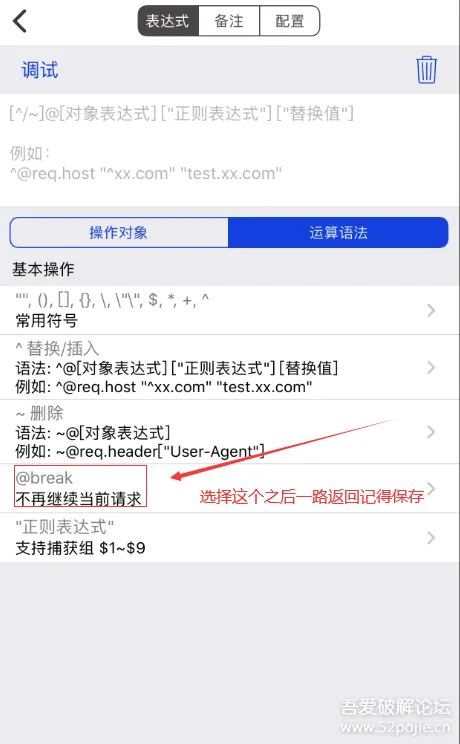 然后我们返回-编辑-添加表达式(条件满足时)选择运算语法 选择@Break 不再继续当前请求。