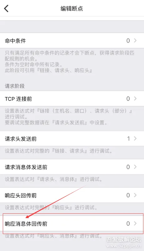 可以选择提取到我们刚刚写好的去广告规则那里-挂载断点-编辑断点-这次选择的是 响应消息体回传前,因为我们要改的就是响应消息体里面的信息。