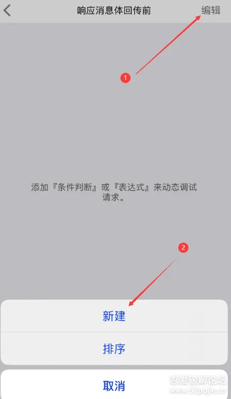 平时都是选择响应消息体回传前,这次我们选请求头发送前,然后继续右上角点编辑-新建-判断条件-操作对象选择 @req.host 主机地址