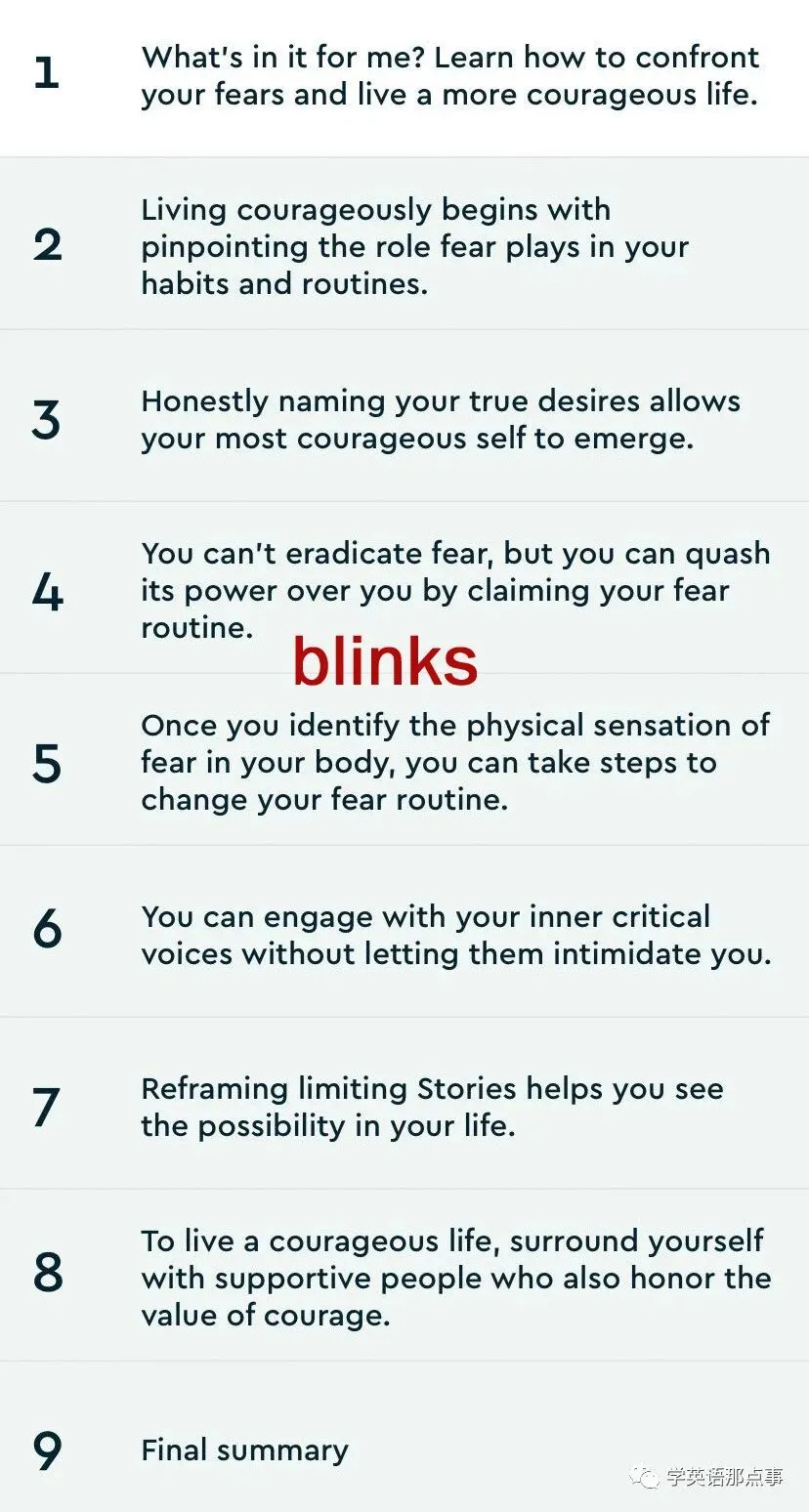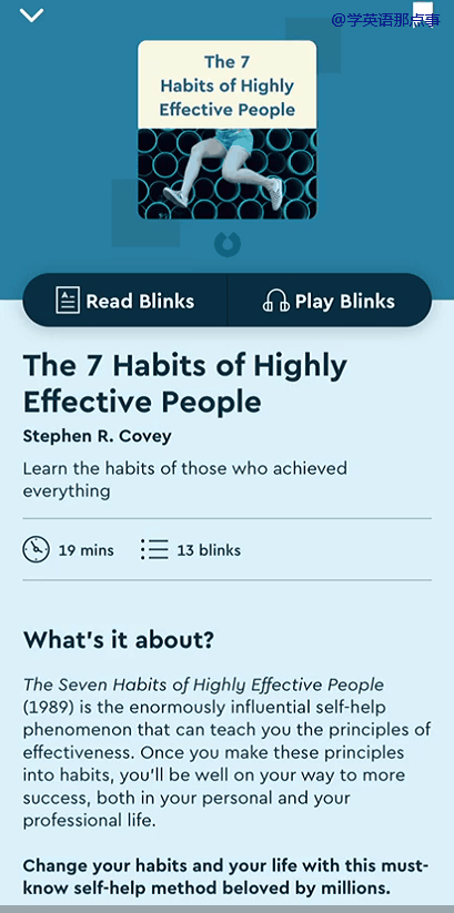 在 Blinkist 中,《The 7 Habits of Highly Effective People》被凝练为 13 个主要关键点(即 13 个 blinks),每个 blink 包含约 300 字的内容和一个概括性的一句话小标题,让你在连这 300 字都没时间读的情况下也能迅速而有逻辑地了解书籍关键主旨所在。