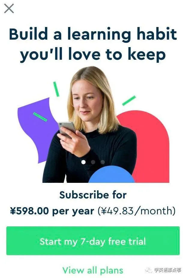所以如果你在 App 内看到下图这个“免费试用7天”的界面,如果还不了解软件内容适不适合自己的长期学习计划,或者已知自己绝不会付费使用的话,学姐建议,不要点绿色的”Start my 7-day free trial”按钮,因为有很大概率你会忘记在 7 日内把它取消掉。