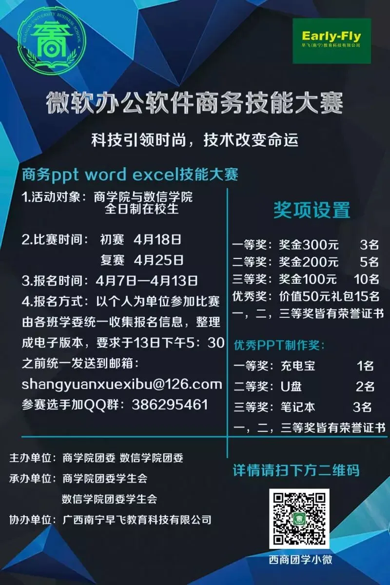 为配合学校培养综合素质人才,加强我校学生办公能力,提高学生就业核心竞争力,正确传达校企合作人才培养方案,同时配合我院“翱翔职场,放飞梦想”活动的开展,商学院联合数信学院共同举办“第二届早飞商务办公软件技能大赛“。本次比赛特邀早飞教育科技有限公司——广西唯一专业办公软件商务应用技能学习平台共同举办,旨在提升我院学生商务办公意识,提高全院商务办公能力。