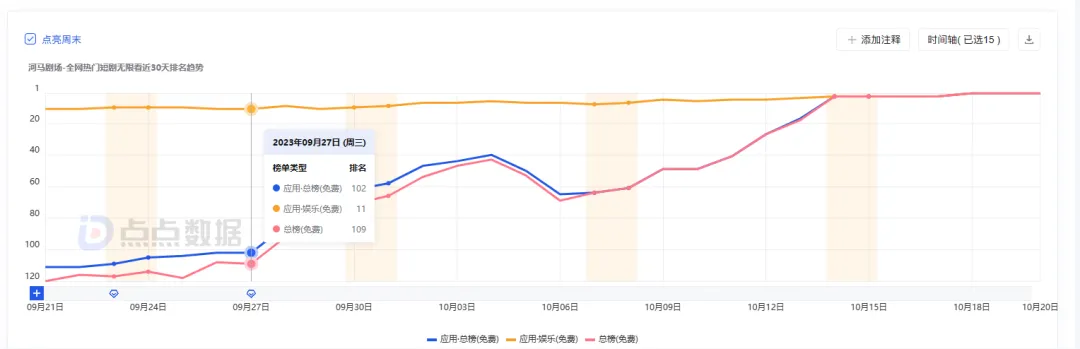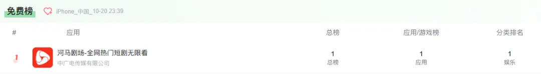 其次是榜单的优化,榜单分为总榜和分类榜;河马剧场APP将娱乐榜单与总榜单排名均提升至TOP1,近几日整体维持在榜单前三的水平。