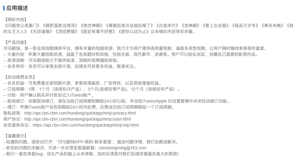 在应用描述中,将【精彩内容】置于首位,列举一些较受欢迎的短剧名字,对于有定向需求的用户能够第一时间捕捉到关键词,提高转化率。