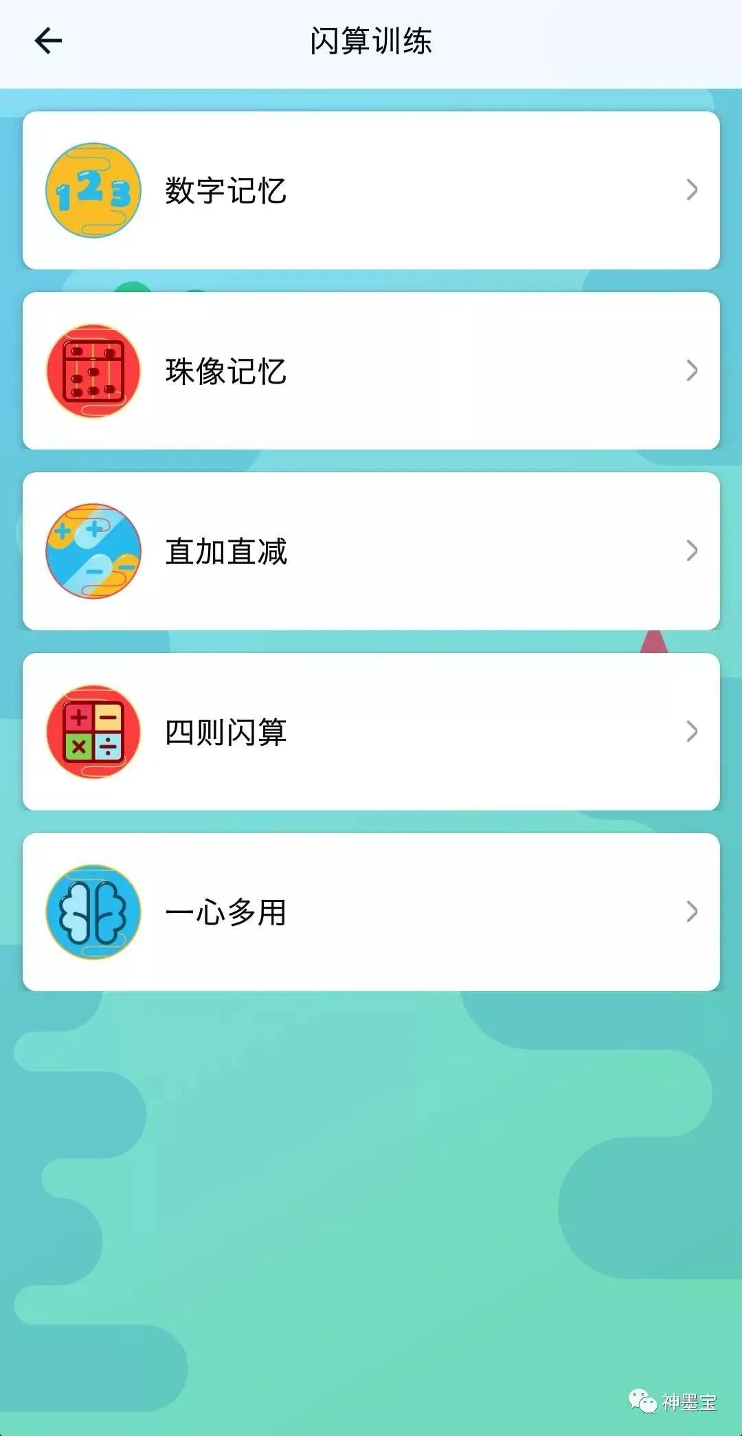 一、闪算训练包含:数字记忆、珠像图记忆、直加直减、四则运算、一心多用5部分的内容。