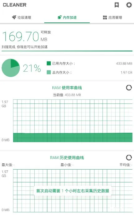 进入首页,三个选项,垃圾清理和内存加速以及应用管理。