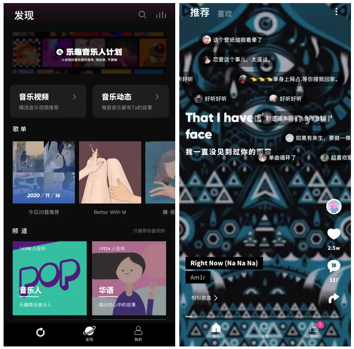 非常酷炫,电子风格界面带来爽快的视觉冲击力,动态背景特效风格各异、抓人眼球,弹幕式的评论让你听歌不孤单。