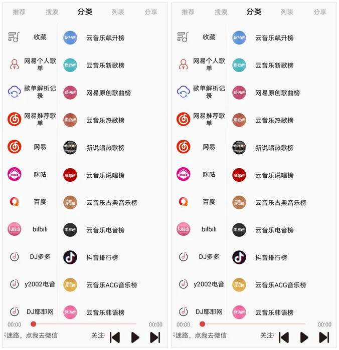 如果你使用「轻音乐」,完全不用担心,在「分类」功能中登录个人账号,即可导入多个平台的歌单,还能找到各个音乐平台的排行榜,超方便!
