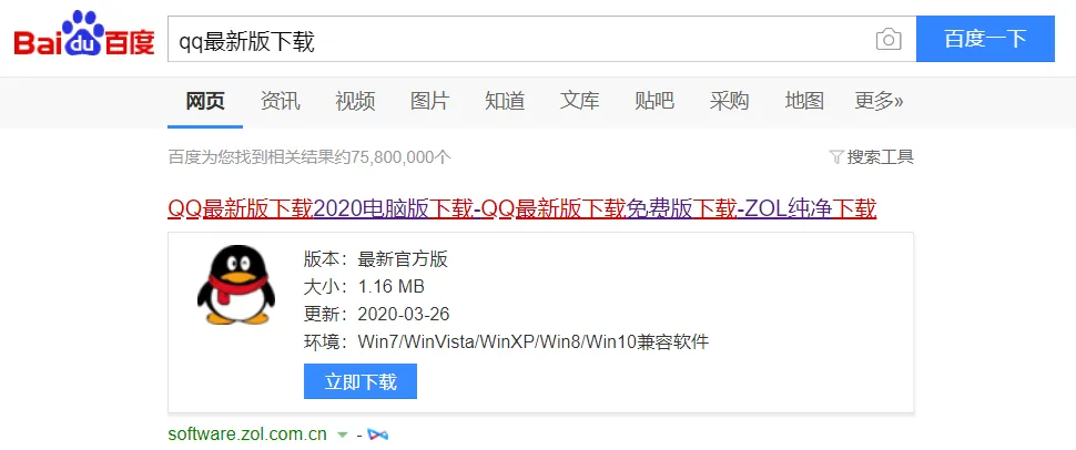 她们的通常做法是百度搜索:xxx最新版,然后从第一个网页进去下载,例如这样👇