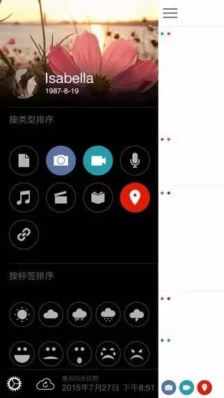 Flava 的主界面用小图标组织心情、天气、多媒体内容等信息,用时间线把日志排序,而左右滑动出现的菜单能够方便的生成和管理日志。