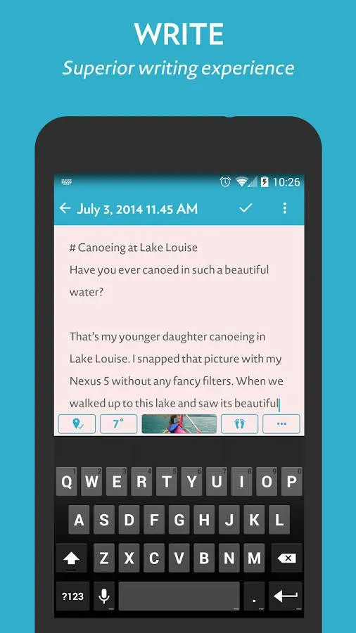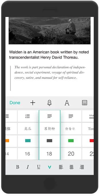 严格来说Zine并不是日志APP,而是一个在手机上写作工具,它的目标是让你在手机上非常方便的写作和排版,能进行杂志质感的图文排版,字体是方正字库的正版字体,支持语音输入,只需将光标放在段落中,直接用手机滑动就能选择字体、颜色、字号等进行选择,而且可以直接分享到微信、微博和印象笔记。