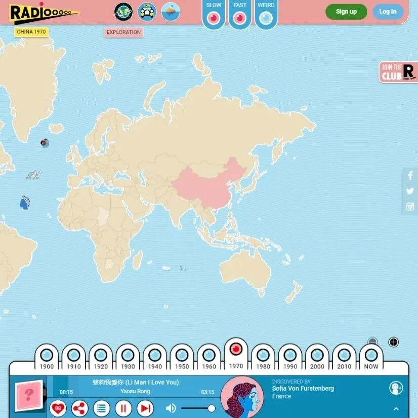 Radiooooo可不会一个国家只给你一首歌,Radiooooo提供三种口味的音乐:舒缓、快节奏以及比较奇怪的节奏。