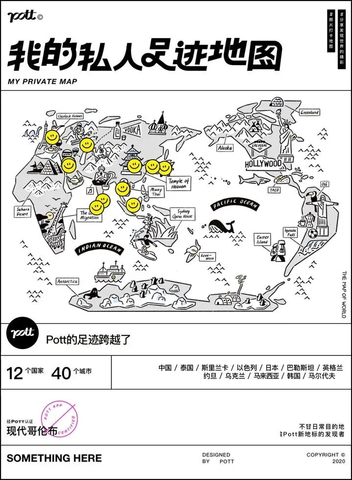 但在Pott,你不仅可以根据引导,一点点搜集回忆,最后还会自动生成一个手绘版的足迹地图,现在还可以生成视频版。