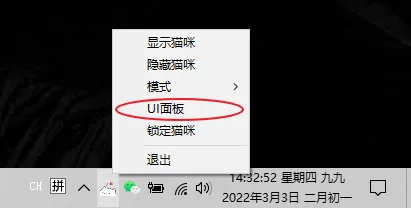 在电脑右下角可以打开UI设置面板,也可以快速切换模式、显示/隐藏猫咪。