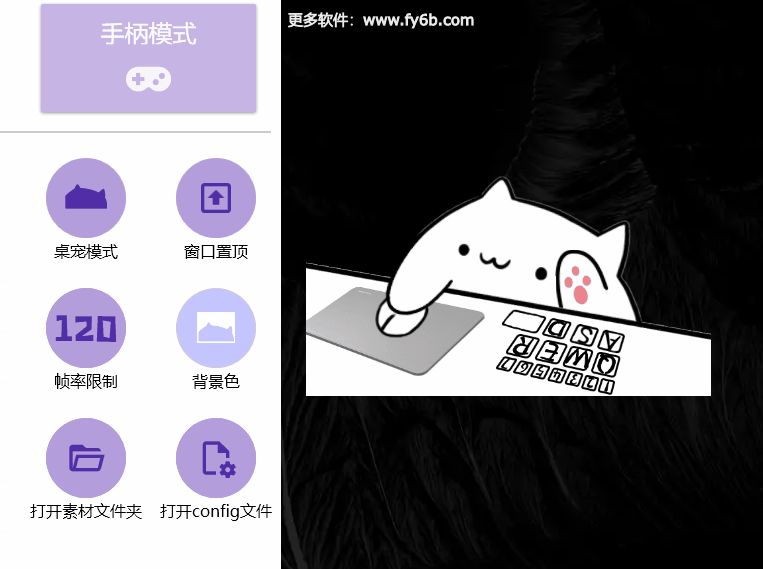 启动软件后会在桌面显示一只可爱的小猫咪,它会模仿你的一举一动,无论是移动/点击鼠标 还是敲键盘,它都能实时同步,因此可以让很多游戏主播更直观的展示出自己单身几十年的手速。