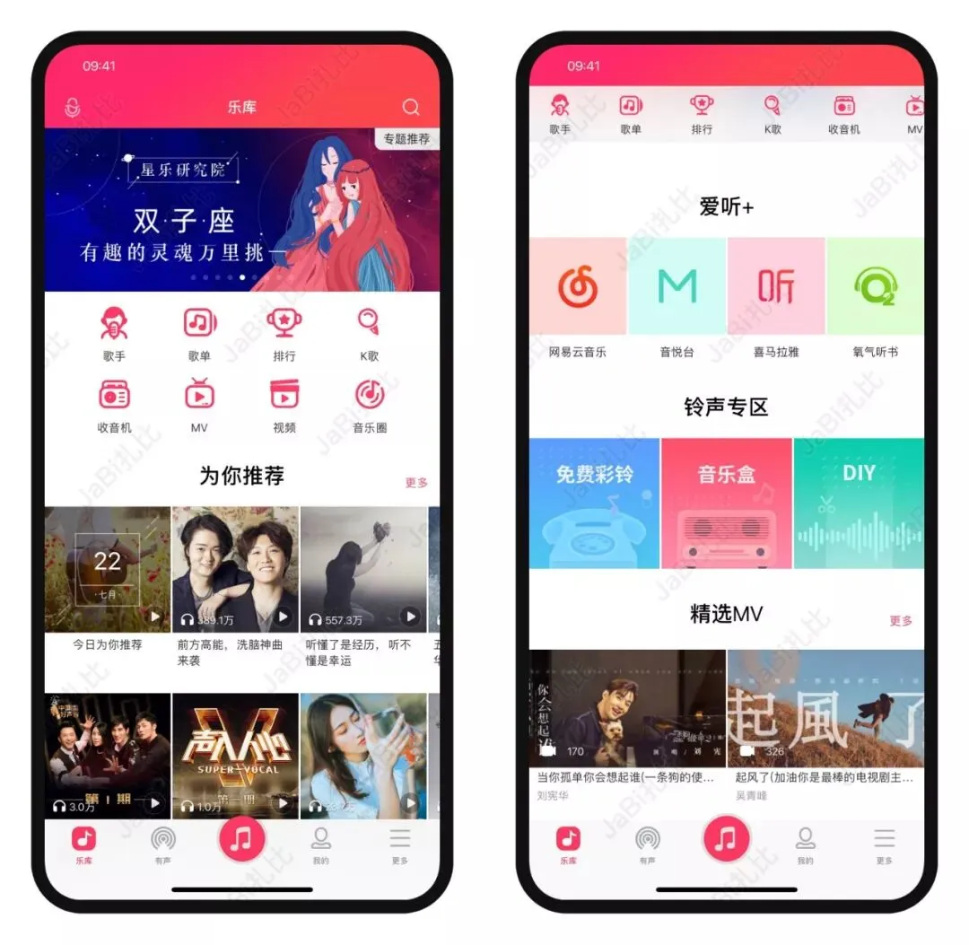 打开首页,也就是「乐库」页,App 会推荐一些热门歌单、新歌速递、精彩 MV 等一些内容。