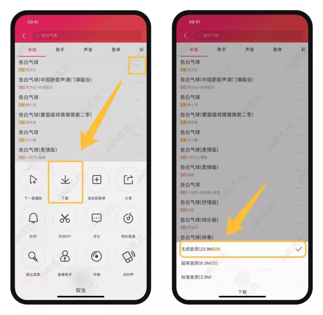 我们回到「爱听 4G」App,搜索并下载杰伦的《告白气球》,会发现是可以直接选择无损音质并且下载到本地的。